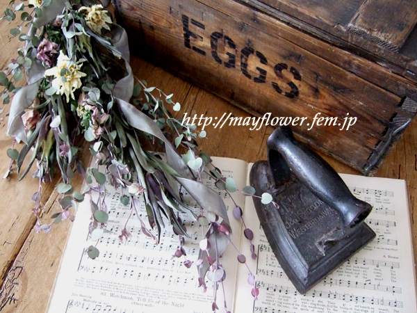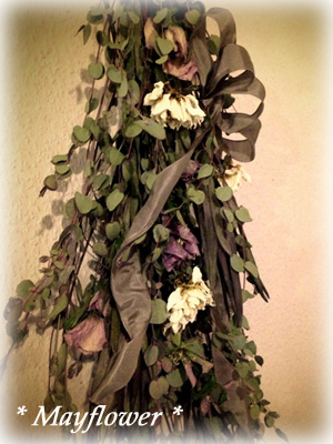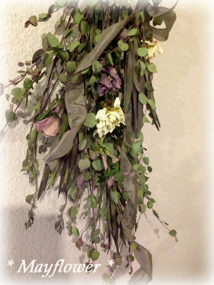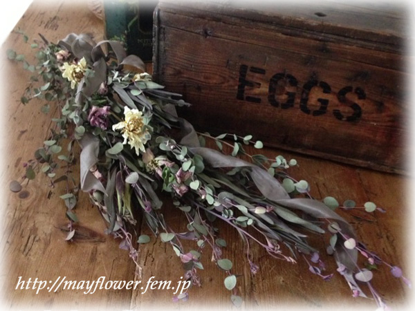 リュウカデンドロン・ダリア・ユーカリ・クリスマスローズを使ったスワッグアレンジです。
