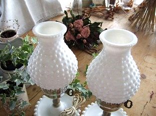 * E-037 * * Milk Glass Lamp Set B * H: 32cm×Φ: 13 cm(シェードの1番大きな部分)×2 とってもステキな Milk Glass Lamp Set です! ラインがとてもエレガントで存在感があります。 金属部分の色はシルバーで、変色している部分があり、ガラス部分もキズと片方のシェードの差し込み(本体の金属部分に差し込む部分)に欠けが2ヶ所ございますが、差し込みの部分ですので分かりませんしその部分で怪我をするようなことはございません。(写真でご確認くださぃ) ランプをつけると、ミルクガラスがその光を受けて、暖かい光が包んでくれますょ♪ コンセントは、日本で問題なくご使用いただけますし、電球も日本のもので大丈夫です! ベッドサイドに置いて、寝る前に外したピアスやネックレスをちょっと置いておくのにもいいですねぇ♪ このランプがあるだけで、お部屋がぐっとエレガントになりますよ♪ ベッドサイドやメイクルーム・リビング、どこに置いて使おうか・・・と考えると嬉しくなっちゃいますね♪